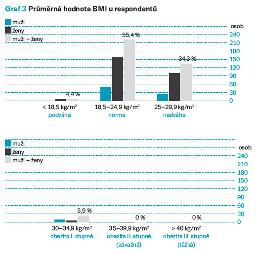 Body Mass Index (BMI) byl stanoven na podkladě standardně využívaného vzorce rovněž u všech respondentů. Nejčastěji stanovené hodnoty byly v rozmezí normy, a to celkem u 55,4 % osob. U 4,4 % byla měřením zjištěna podváha – jednalo se výhradně o ženy. Nadváhou trpělo 34,3 % osob, z nichž většina byly rovněž ženy. Obezita I. stupně byla vypočtena u 5,9 % respondentů, kde byli více zastoupeni muži. Další stupně obezity naměřeny nebyly. Průměrná hodnota BMI u respondentů byla 24. Podrobná data ukazuje graf 3 – BMI.