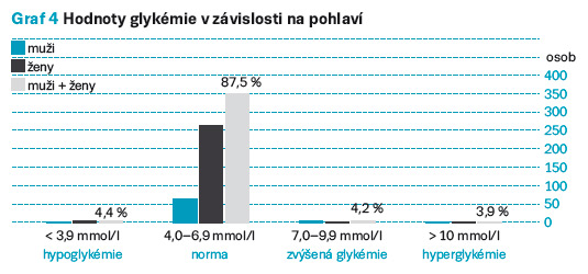 Jednou z dalších hodnot, která byla monitorována, byla hladina krevního cukru – glykémie. Česká diabetologická společnost stanovuje hladiny a referenční meze k diagnostice prediabetu a diabetu. U sledovaných respondentů byl brán v úvahu fakt, že většina z nich před vyšetřením cíleně nelačnila a byla analyzována pouze kapilární krev. Proto byly za normální hodnotu glykémie považovány výsledky do 6,9 mmol/l. Všichni respondenti byli tázáni, zda netrpí diabetem mellitem. Pokud měli diabetes diagnostikován, bylo zjišťováno, jakým způsobem je léčen (dieta, perorální antidiabetika, inzulinoterapie). V 87,5 % měření byla zjištěna normální hladina krevního cukru. U 4,4 % osob byly naměřeny snížené hodnoty glykémie. Ani u jedné z těchto osob se nejednalo o diabetika nebo gravidní ženu. Naopak zvýšená hodnota glykémie nad 7 mmol/l byla zjištěna u 8,1 % respondentů, z toho polovina z nich byli diagnostikovaní diabetici. Rovněž mezi nimi nebyla žádná gravidní žena. Průměrná hodnota glykémie respondentů byla 5,7 mmol/l, nejnižší hodnota pak 3,4 mmol/l u ženy a nejvyšší 14,6 mmol/l u muže, který měl diagnostikován diabetes mellitus. Výsledky podrobně znázorňuje graf 4 – Hodnoty glykémie v závislosti na pohlaví.