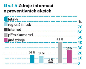 V rámci evaluace byla zjišťována spokojenost respondentů s proběhlými preventivními akcemi, všeobecně zájmem o prevenci a preventivní akce, způsoby, které respondenty v rámci prevence kladně osloví, případně motivují k účasti, včetně náplně preventivních akcí. Návratnost evaluačních dotazníků byla pouze 50 %, avšak ve většině případů kvalitně vyplněných. Z výsledků vyplynulo, že o akce preventivního charakteru mají zájem nejvíce lidé s dokončeným středoškolským vzděláním s maturitou, 35,3 % odpovídajících respondentů, kteří projevili zájem o preventivní akce, mělo ukončené vysokoškolské vzdělání. Naopak zájem o preventivní screening neprojevila naprostá většina osob se základním vzděláním a středoškolským bez maturity. Průměrný věk osob, které odevzdaly evaluační dotazník, byl 35 let, z toho 68 % byly ženy. Mezi informační zdroje, kde se respondenti dozvěděli o proběhlých screeningových akcích, patřila ve 42 % informace od kamaráda, přítele nebo známého. Naopak nejméně byli respondenti informováni díky internetu. Mezi jiné zdroje, ve kterých se lidé dozvěděli o připravovaných besedách – preventivních akcích s možností měření vybraných fyziologických hodnot apod., patřily například letáky přímo v budovách, kde akce probíhaly, a dále pak školy nebo ambulance praktických a odborných lékařů, kde byly letáky s informacemi o plánovaných preventivních akcích rovněž rozmístěny (graf 5 – Zdroje informací o preventivních akcích).