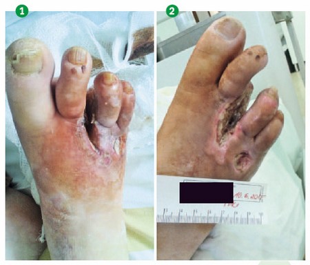 Pacientka M. K., 69 let, po klínové amputaci třetího prstu na pravé noze 16. května 2015 pro diabetickou gangrénu s flegmonou. V souvislosti s nesprávně zvolenou obuví si dne 10. května 2015 poranila prst (doma chodila bez obuvi a při manipulaci s dveřmi si přivřela 3. prst u nohy).