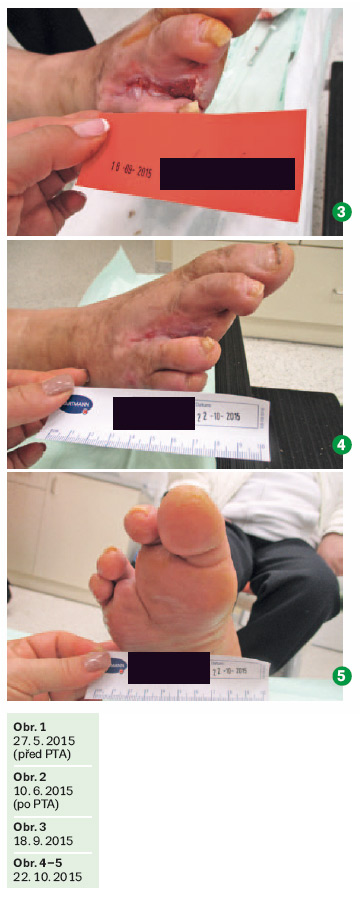 Do ambulance hojení ran byla pacientka odeslána 27. května 2015. Po řádném vyšetření byla ještě téhož dne odeslána do cévní ambulance vzhledem k suspekci na progresi postižení tepen. Zde byl diagnostikován špatný stav končetiny, která byla ohrožena ischémií a případnou sepsí z defektů. Bylo navrženo časné provedení angiografie pravé dolní končetiny (PDK) a eventuálně perkutánní transluminální angioplastika (PTA) i při známé chronické renální insuficienci. Ve FN Motol bylo pacientce 4. června 2015 provedeno PTA. Dne 10. června 2015 navštívila pacientka opět naši ambulanci hojení ran, kde byla započata lokální léčba defektu pomocí vlhké terapie. Byla provedena i řádná edukace pacientky v oblasti péče o diabetickou nohu, pacientce byla poskytnuta dopomoc v zajištění odlehčovacích pomůcek v rámci defektů v poli SDN a zabezpečení převazů za pomoci HomeCare (převazy se prováděly třikrát týdně – jednou týdně v ambulanci hojení ran a dvakrát týdně v domácím prostředí za pomoci sester z HomeCare).