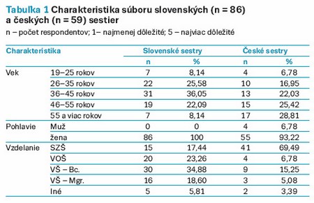 Základný súbor tvorilo 145 respondentov. Najviac slovenských sestier (36,05 %) bolo vo vekovej kategórii 36–45 rokov a české sestry (28,81 %) mali dominantné zastúpenie vo vekovej kategórii nad 55 rokov. Podľa dosiahnutého vzdelania malo najväčšie zastúpenie v súbore 35 % (n = 30) slovenských sestier s bakalárskym stupňom vzdelania a 69,49 % (n = 41) českých sestier so stredoškolským vzdelaním. Súbor slovenských sestier mal 100% ženské zastúpenie, pri českých sestrách tvorili ženy 93 % (n = 55) a muži 7 % (n = 4). Demografické údaje sú uvedené v tabuľke 1.