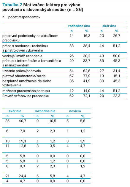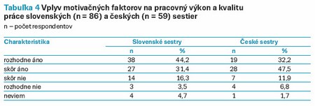 Sestry sa v našej štúdii vyjadrovali k jednotlivým motivačným faktorom. Zaujímalo nás, či všetky spomínané faktory majú vplyv na ich pracovný výkon a dopad na kvalitu práce. Slovenské sestry túto skutočnosť rozhodne potvrdili (44,2 %) alebo skôr potvrdili (31,4 %). U českých sestier sa rozhodne áno vyjadrilo 32,2 % a skôr áno 47,5 %. Výsledky vyhodnotenia uvádzame v tabuľke 4.