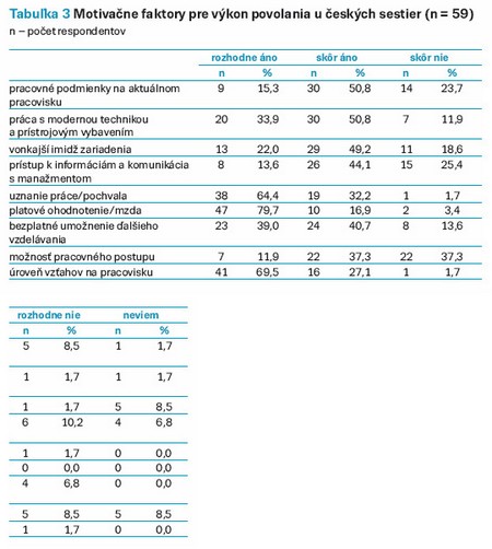 Sestry sa vyjadrovali k viacerým motivačným faktorom. Podľa zaznamenaných výpovedí nie sú pracovné podmienky na súčasnom pracovisku motivujúce pre 51,2 % slovenských sestier. Naopak u dvoch tretín (66,1 %) českých sestier ide o významný motivačný faktor. Práca s modernou technikou a prístrojovým vybavením rozhodne motivuje 89,6 % sestier na Slovensku a 84,7 % sestier v Čechách. Vonkajší imidž zariadenia motivuje slovenské sestry o niečo viac ako české. Efektívna komunikácia s manažmentom slovenských nemocníc a prístup k informáciám je pri výkone povolania motivujúcim faktorom pre 79 % sestier. Pre nadpolovičnú väčšinu českých sestier (57,7 %) je takáto komunikácia tiež motivujúca. Pri výkone povolania slovenských sestier je najviac dôležité uznanie práce a pochvala, čo dokumentovali v 94,2 % odpovedí. Túto skutočnosť podobne potvrdili skoro všetky ich české kolegyne. Pre 93 % slovenských sestier je silným motivačným faktorom platové ohodnotenie ich práce. České sestry (96,6 %) motivuje platové ohodnotenie ešte výraznejšie. Iba pre 11,6 % sestier na Slovensku a pre 20,4 % českých sestier nie je pre výkon povolania motivujúce bezplatné umožnenie ďalšieho vzdelávania. Kariérny postup nie je motivujúci pri výkone povolania pre necelú tretinu (30,2 %) slovenských sestier a podobný názor potvrdzuje 45,8 % českých sestier. Úroveň vzťahov na pracovisku motivuje pri výkone povolania 95,4 % slovenských a 96,6 % českých sestier.