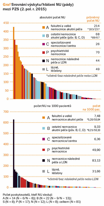 Následující přednáška už patřila tomu, na co všichni zúčastnění netrpělivě čekali – analýze výsledků pilotního sběru agregovaných dat o hlášení nežádoucích událostí (NU) za 2. pololetí 2015, které přednesl RNDr. J. Mužík, Ph.D. Ten nejprve krátce pohovořil o způsobu sběru dat a formulářích, které k tomuto účelu slouží, a následně představil jednotlivé sledované údaje podle kategorií zdravotnických zařízení (A, B, S, P, N a L). Výskyt hlášených NU představil jednak podle kategorie poskytovatele zdravotních služeb (PZS), jednak podle jednotlivých NU. Z analýz vyplynulo, že mezi nejčastější hlášené patří NU zařazené do kategorií Dekubity, Pády, Chování osob, Nehody a neočekávaná zranění a Klinický výkon. Důležité je také srovnání výskytu hlášení NU nejen podle absolutního počtu hlášení NU, ale i v přepočtu NU na tisíc pacientů. Srovnáme-li totiž například NU Pády mezi jednotlivými PZS podle absolutního počtu NU, pak jednoznačně vede kategorie A – fakultní a velké nemocnice s číslem 214. Přepočteme- li však počet NU na 1000 pacientů, rázem se na přední místo dostane kategorie N – nemocnice následné péče a LDN s číslem 83,16 (fakultní a velké nemocnice se přesouvají na předposlední místo v grafu s počtem 7,48) (viz graf). Stejné porovnání představil RNDr. Mužík, Ph.D., i u dalších čtyř nejčastěji hlášených NU. Současně s tím upozornil, že podle zákona musí ÚZIS zveřejňovat pouze anonymní data, ale pro jednotlivé poskytovatele zdravotních služeb zapojených do SHNU je vypracovávána podrobná analýza, v níž je jasně označeno, jak si konkrétní zdravotnické zařízení stojí vzhledem k průměru v dané oblasti a vzhledem k ostatním zdravotnickým zařízením ve stejné kategorii. Během svého sdělení pak upozornil ještě na nejčastější metodické chyby u hlášení tzv. jiných NU a zaměřil se i na detailní sledování pádů a dekubitů. V závěru pak upozornil, že pilotní sběr dat umožnil kvantitativní hodnocení hlášených NU a byly identifikovány hlavní metodické nedostatky kategorizace NU na lokální úrovni s možností sdíleného učení do budoucna. „Hlavním limitem analýzy je rozsah a úplnost předávaných údajů,“ upozornil RNDr. Mužík, Ph.D. Výjimkou jsou podle jeho slov nežádoucí události Pád a Dekubitus, které sledují a hlášení o nich odevzdali téměř všichni poskytovatelé zdravotních služeb. Ovšem stále existují rozdílné názory na to, zda se opravdu jedná o nežádoucí události, či o klinický jev, jehož příčinou je aktuální stav pacienta. Dalším kladem pilotního šetření je, že analýzou byla ověřena účelnost a použitelnost zvoleného způsobu sběru dat. Srovnání je tak možné provést nejen podle absolutních počtů, ale i v přepočtu na celkový počet pacientů. Díky těmto datům je možné hodnotit nejen PZS na individuální úrovni, ale i v rámci odpovídajících kategorií PZS, při srovnání mohou být zohledněny i rizikové faktory výskytu NU. „Byly zjištěny i rozdíly ve výskytu hlášených NU podle typu poskytované péče,“ uzavřel své sdělení RNDr. Mužík, Ph.D.