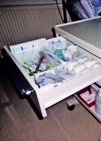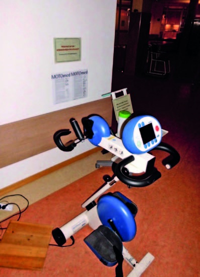Poté dostali klienti své léky, a to jak v tuhé formě, tak v drcené. Jakmile bylo vše potřebné vykonáno, mohla jít sestra k dalšímu klientovi, až byly projity všechny pokoje. Teprve pak se šlo na ranní hygienu. U některých klientů ji vykonávala sestra, u některých fyzioterapeutický tým, který u klienta provedl rovnou i terapii. Při hygieně se také prováděly převazy, a to jak tracheostomických kanyl, tak PEGu, nasogastrické sondy (NSG), ale i flexyl, bandáží a dalších převazů, které klient vyžadoval, ať už měl drobná poranění, nebo chronické rány. Na každém pokoji byly převazové vozíky, ve kterých byl vždy dostatek materiálu (obr. 5). Po hygieně se každý vozík očistil a vydezinfikoval. Po ranní hygieně se klienti oblékli a posadili na vozíky. Pokud byl klient těžký a sestra neměla nikoho po ruce, kdo by jí pomohl, vypomohla si zvedákem, tzv. liftem. Každému klientovi se převlékla postel do čistého ložního prádla a poté se někteří klienti odvezli na vozících do vestibulu oddělení, kde se scházeli na snídani. Pacientům, kteří se léčili s diabetem mellitem, byl před snídaní aplikován inzulin. Všimli jsme si tu jedné zvláštnosti – pokud pacient zemře nebo je přeložen jinam, jeho inzulinové pero se vždy vyhodí. Pokud je přeložen na jiné oddělení v rámci kliniky, dostane pero nové. Mobilní klienti se do vestibulu dopravili sami a o zbytek se postaral zkušený personál. Imobilním klientům byla strava podávána parenterálně pomocí NGS. Svůj stůl měli ve vestibulu také ergoterapeuti, kteří klienty učili, jak se najíst, znovu si osvojit správné stravovací návyky a vše, co s tím souvisí (např. podat si sklenici, otevřít si láhev apod.). Ostatní klienti se najedli sami nebo s dopomocí sestry. Tím práce sester končila a nastal čas pro ergo- a fyzioterapeuty. Ti klienty učili např. jak chodit po rovině, po schodech, šlapat na kole (obr. 6), učili je vstávat z vozíku anebo je učili chodit s různými typy protéz. Ergoterapeuti byli podstatnou součástí kliniky. Učili klienty různým logickým a motorickým dovednostem, ať už šlo o otevírání dveří, vyšroubování matky ze závitu apod. Hráli s nimi také nejrůznější logické hry.