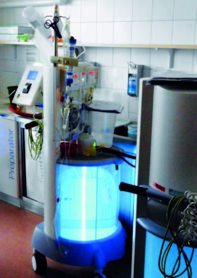 Po svačině, která byla kolem 9.30 hodin, provedla sestra inventář v převazovém vozíku, které byly na pokojích, a v případě potřeby jej doplnila ze skladu (obr. 7). Poté se věnovala administrativě. Já jsem jako praktikant pomáhal ostatním kolegům a kolegyním s transportem klientů na různá vyšetření – RTG nebo CT. Jedna věc tu byla jedinečná, a to „transportní dialýza“. Šlo o přístroj, který se dal vzít ke klientovi na pokoj a dialýza tak mohla proběhnout v pohodlí jeho pokoje. Přístroj měl speciální náplň, která vydržela na dialýzu několika klientů. V průměru trvala tato dialýza šest hodin a po jejím skončení se ozval zvukový signál (obr. 8). Pokud byli klienti soběstační, mohli si jít zaplavat do některého z mnoha bazénů, které se nacházely přímo na klinice (obr. 9).