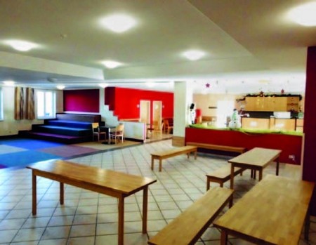 Dětská klinika je jednou z mnoha klinik areálu Bavaria (obr. 11). Jedná se opět o rehabilitační kliniku pro děti, která má různá oddělení (neurologie, jednotky intenzivní péče apod.), jež jsou barevně rozlišena. Tato klinika má své ergoterapeuty, fyzioterapeuty a také dětské sestry. Existuje tu roaming-in stejně jako u nás. Děti tu „bydlí“ pospolu, většinou po čtyřech až pěti. Tato klinika nabízí také privátní školu, takže děti nemusejí chodit nikam daleko a nepřijdou o výuku. Na této klinice se také specializují odborníci (ergo- a fyzioterapeuti) z nedalekých Drážďan. Klinika disponuje vlastní posilovnou a ergoterapeutickou dílnou, kde si mohou děti hrát, vytvářejí tu různé obrázky nebo předměty z keramiky apod. Dále tu mají i další terapeutická cvičení, jako je muzikoterapie, sportovní terapie, logopedie a další. Ve vestibulu kliniky byl prostor, kde mohly děti jednou týdně sledovat divadlo, které pro ně přichystali pracovníci kliniky (obr. 12). Opět tu byly různé přístroje a pomůcky, které pomáhaly zdravotnickému personálu při jejich práci s klienty. Výživové poradenství je také jednou z hlavních funkcí této kliniky, proto tu je kuchyně, v níž si děti mohou samy vyzkoušet různé recepty na jídla vhodná pro jejich dietu, popřípadě, pokud se jednalo i diabetiky, jak zacházet s výměnnými jednotkami a mnoho dalšího. Toto poradenství bylo určeno dětem s diagnózou diabetes mellitus I. a II. typu, celiakie, obezita, Prader-Willi syndrom, onemocnění ledvin aj. Interiér budovy na nás působil velmi přátelsky a vyvolával příjemnou atmosféru.