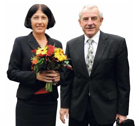 Ředitelka školy Mgr. Lenka Nováková vítá ministra zdravotnictví doc. MUDr. Leoše Hegera, CSc., při příležitosti oslav 50. výročí založení SZŠ v Turnově (12. 10. 2011)