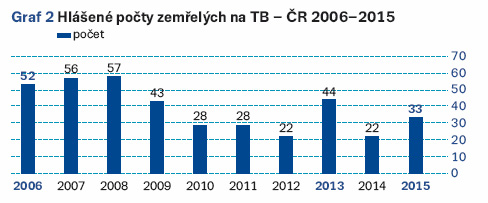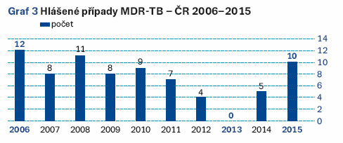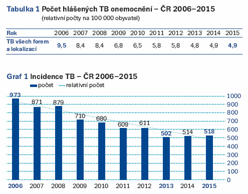 V Česku je stav mnohem příznivější, v roce 2015 byla incidence TB 4,9 případu na 100 000 obyvatel (tab. 1), což znamená, že nově bylo onemocnění diagnostikováno u 518 osob (graf 1). Mortalita má v Česku klesající tendenci, v roce 2015 zemřelo na TB 33 osob, v roce 2008 to bylo 57 osob (graf 2). V ČR je nízký výskyt MDR-TB, pohybuje se okolo 10 osob ročně (graf 3).