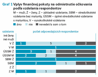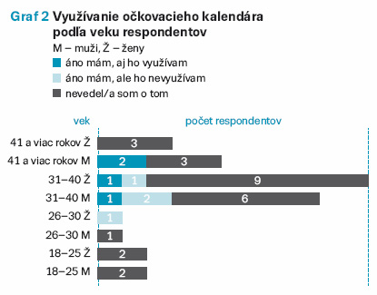 Dojem, že očkovanie vo svete nie je nutné, vyvoláva aktuálna priaznivá situácia vo výskyte infekčných ochorení. Tento pocit u širokej verejnosti potvrdzuje účinnosť očkovania a ochranu detí pred nákazami a taktiež bezpečnosť vakcín (Kovács, 2010). Z výsledkov prieskumu sme zistili, že úplný súhlas s tvrdením, že očkovanie je najúčinnejšia forma prevencie, vyjadrilo 15 (44,1 %) opýtaných rodičov. Úplný nesúhlas vyjadrili 3 (8,8 %), a to dvaja muži a jedna žena. Respondenti pri tvrdení, že očkovanie je zbytočné, vyjadrili skôr nesúhlas s tvrdením, a to 13 (38,2 %) zo všetkých 34 respondentov. Úplný nesúhlas vyjadrilo 11 (32,4 %) respondentov, 4 (11,7 %) muži a 7 (20, 5 %) žien. Na stranu súhlasu sa priklonilo 10 (29,4 %) respondentov. Nesúhlas s tvrdením, že kvôli negatívnym skúsenostiam dieťa očkovať nedá, vyjadrilo 29 (85,3 %) rodičov. Chorobu ako dôvod na odmietnutie očkovania uviedlo 31 (91,1 %) respondentov. S tvrdením, že očkovanie je nedostatočná ochrana pred infekciou, vyjadrilo úplný súhlas 6 (17,6 %) rodičov. S tvrdením, že rodičia majú byť tí, ktorí rozhodnú o očkovaní dieťaťa, bolo stotožnených 14 (41,2 %) rodičov a dvaja (5,9 %) úplne nesúhlasili. Dvanásť (35,2 %) žien a 11 (32,3 %) mužov (67,6 %) úplne súhlasili, že povinné očkovanie by nikdy nemalo byť zrušené. Úplný nesúhlas s výrokom, že nepovinné očkovanie je zbytočné, povinné očkovanie môjmu dieťaťu stačí, vyjadril iba jeden muž (2,9 %) zo všetkých rodičov. Úplný súhlas s výrokom, že pri nepovinnom očkovaní ma zaujíma cena vakcíny, sa rozhodlo prideliť 15 rodičov (44,1 %). U výroku viac informácií o očkovaní by mal poskytovať pediater reagovali všetci respondenti úplnou zhodou súhlasných odpovedí. U 12 (35,2 %) opýtaných respondentov bol zdrojom informácií o očkovaní práve pediater. Najväčšiu skupinu však tvorili rodičia, ktorí najčastejšie získavajú informácie o očkovaniach detí od svojich známych – 21 (61,8 %). Z internetu čerpajú informácie skôr ženy 9 (26,4 %) ako muži 7 (20,5 %). V menšej miere rodičia získavajú informácie o očkovaní z televízie, rádia – 3 ženy (8,8 %) a 7 (20,6 %) mužov. Z kníh, časopisov a odbornej literatúry čerpajú informácie v rovnakom zastúpení muži a ženy – 7 (20,6 %). Názor lekára na očkovanie je pre 29 (85,3%) rodičov podstatný, záleží im na ňom, vždy im pomôže sa rozhodnúť, či dajú dieťa očkovať, alebo nie. Pri rozhodovaní dať dieťa zaočkovať názory a skúsenosti iných rodičov nezaujímajú 8 (23,5 %) respondentov. Pri analýze vedomostí rodičov sme zisťovali, či respondenti majú vedomosť o tom, že keď odmietnu povinné očkovanie svojho dieťaťa, môžu byť sankcionovaní pokutou až do výšky 331 €, a či ich tento fakt pri rozhodovaní očkovať dieťa ovplyvní. Až 13 (38,2 %) rodičov, z toho 7 (20, 6 %) mužov a 6 (17,6 %) žien, o tomto fakte nevedelo. Tento fakt ovplyvní pri rozhodovaní dať svoje dieťa zaočkovať 11 (32, 3 %) rodičov, a to šesť mužov a päť žien. Tento fakt neovplyvní rozhodovanie a rodičia sú ochotní znášať pokutu až do výšky 331 eur uviedlo 10 (29,4 %) respondentov (graf 1). Prieskumom sme zistili, že len štyria rodičia (11,8 %) vlastnili očkovací kalendár a zároveň ho aj využívali (graf 2).