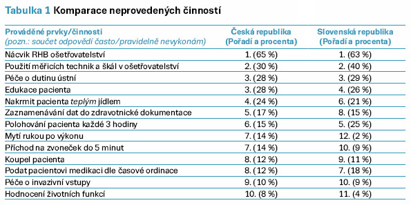 Ve výsledcích našeho výzkumu je zajímavé porovnání mezi ČR a SR ohledně ukazatelů vedoucích k důvodům neposkytnutí péče. Shoda panuje mezi oběma státy v poddimenzovanosti personálu (ČR 87 %, SR 95 %) a v nedostatku nižších nelékařských pracovníků (ČR 89 %, SR 94 %). Významný vliv má také skladba pacientů na oddělení, která je důvodem neprovedení péče v obou zemích shodně u 85 % respondentů. To, v čem se pohled českých a slovenských sester odlišoval, byl nedostatek léku (v ČR 39 %, v SR dokonce 59 %) a nedostatečné technické vybavení (v ČR 58 %, v SR 81 %). Nabízí se otázka, zda je vybavenost pracovišť v obou státech opravdu tak rozdílná, nebo se jedná o subjektivní vnímání sester.