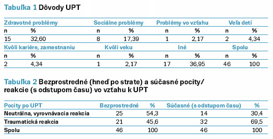 Najviac žien (36,95 %) sa rozhodlo pre UPT z iných dôvodov. Išlo o kombináciu viacerých dôvodov súčasne, a to hlavne finančné problémy, mladý vek, tlak rodičov k rozhodnutiu, zlý psychický stav. Druhým najčastejším dôvodom k UPT boli zdravotné indikácie (32,60 %) a tretím najčastejším dôvodom boli sociálne problémy (17,39 %) (tab. 1).