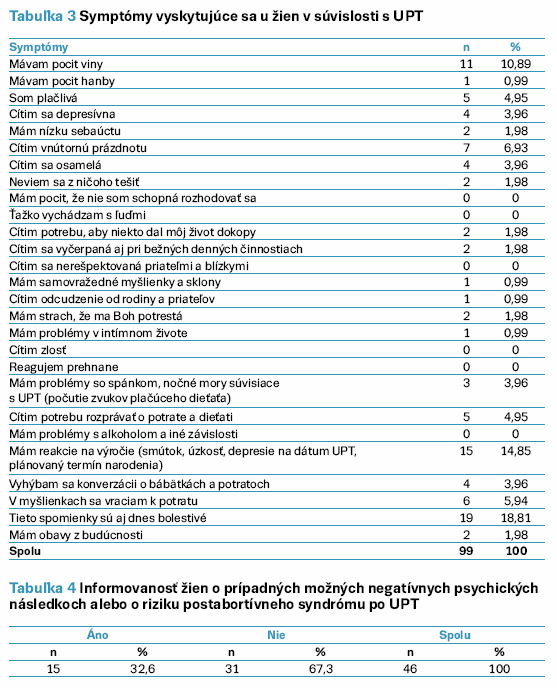 V položke Symptómy vyskytujúce sa u žien v súvislosti s UPT bola možnosť označenia viac odpovedí, celkovo bolo označených 99 odpovedí. Zaznamenali sme najvyšší výskyt nasledujúcich symptómov: spomienky na UPT sú aj dnes bolestivé (18,81 % ), reakcie na výročie (14,85 % ), pocit viny (10,89 %) a vnútorná prázdnota (6,93 %). Viac ako tri príznaky uviedlo 7 žien (15,2 %) (tab. 3).