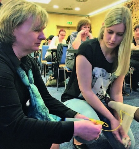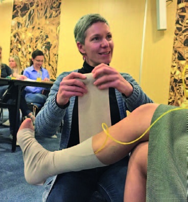 Druhý blok se věnoval režimovým opatřením, která jsou nutná k úspěšné léčbě. Lektorka se v něm zaměřila zejména na kompresi u žilní nedostatečnosti, lymfedému a ukázala, jaký je rozdíl ve vícevrstevné bandáži oproti klasické kompresivní terapii. Účastníci si mohli techniku také sami vyzkoušet a s pomocí přístroje na měření kompresního tlaku si ověřit, zda provedli kompresi dolní končetiny pod optimálním tlakem. Lektorka Bc. Jana Dvořáková také pohovořila o režimových opatřeních nutných k úspěšné léčbě lymfedému a o kontraindikacích kompresivní terapie. Mluvila i o různých typech kompresivních punčoch a o jejich správném používání.