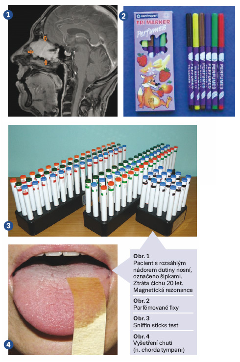 Test parfémovanými fixy (obr. 2) je jednoduchá, rychlá screeningová metoda vyšetření čichu. Používá se při něm šest fixů. V první části testu hodnotí pacienti poruchy čichu a nosní průchodnost a popisují vůni fixů. Ve druhé části testu pak musejí pacienti přiřadit vůni fixů k některé ze čtyř nabízených možností. Dle bodového součtu pak můžeme orientačně čich hodnotit.