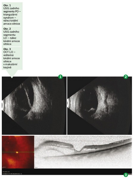 V únoru a březnu 2011 podstoupila pacientka operace v lokální anestezii FAKO + IOL na PO a LO v nemocnici v Ostravě. Následně jí byla v květnu 2013 z důvodu zastřeného vidění na obou očích provedena NdYAG kapsulotomie také v Ostravě. V červnu 2013 přichází na naši kliniku pro náhlé zhoršení zraku na PO. Byla jí diagnostikována amoce sítnice staršího data na PO. Následovala adekvátní vyšetření vzhledem k uvedené diagnóze. Byly provedeny VEP (vizual evokované potenciály) – nález na PO nevýbavný, na UZ Bscan popsán triangulární syndrom (totální amoce sítnice – obr. 1). Operace na PO nebyla doporučena – rizika byla větší než benefity. Při vyšetřeních byl zjištěn náhodný nález lokální amoce sítnice při VMTS (vitreomakulární trakční syndrom – obr. 2, 3). Pacientka je indikována k operaci PPV na LO.