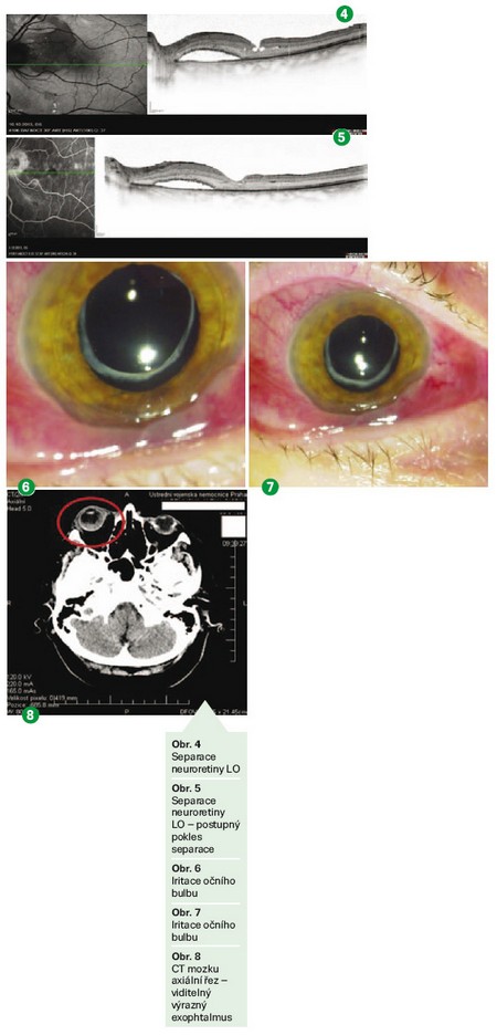 Po dvou dnech léčby se stav nadále horší, jsou přítomny stejné symptomy i na LO (vidoucí oko!!!), dochází k poklesu vidění na LO, paréza n. III, IV, VI.