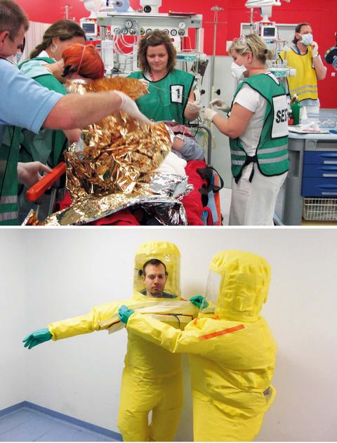 Člen biohazard týmu v ochranném oděvu (dole)