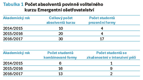 Na základě evaluací se snažíme výuku přizpůsobit ke spokojenosti studentů. Rok od roku zvyšujeme počet kurzů (tab. 1). Počet hlásících se studentů každoročně přesahuje počet vypsaných míst, tudíž je prozatím stoprocentní obsazenost kurzu. Např. v letošním akademickém roce výukou Emergentního ošetřovatelství projde 28 % všech studentů studujících v oboru Všeobecná sestra. Kurz je zařazen do druhého ročníku studia.