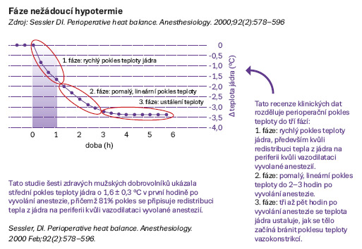 Tělesná teplota je hypotalamem regulována a udržována během celkové i regionální anestezie. Celková anestezie má za následek inhibici centrální vazokonstrikce a zároveň periferní vazodilatace. Naproti tomu regionální anestezie vytváří centrální vazodilataci a inhibuje vazokonstrikci na periferii, což způsobuje redistribuci vnitřního tepla a dochází k tepelným ztrátám. Perioperační hypotermie se během celkové anestezie vyvíjí s charakteristickým třífázovým vzorem. V první fázi, během první hodiny anestezie, dochází k prudkému poklesu teploty o 1–3 °C. Na základě tohoto faktu je nutné dbát na podporu tepelného komfortu i u pacientů podstupujících krátký a nekomplikovaný výkon. Během následujících 2–3 hodin, ve druhé lineární fázi, tepelná ztráta pokračuje, ale vykazuje postupný charakter. Následuje třetí fáze plató, kdy dochází k rovnováze mezi ztrátami a tvorbou tepla organismem. Pooperační návrat k normotermii nastává, pokud koncentrace anestetika v mozku klesne natolik, aby došlo ke znovuobnovení normální termoregulační obrany. Avšak zbytková anestezie a opiáty, které jsou nedílnou součástí pooperační analgezie, snižují účinnost těchto reakcí. Tato reaktivace obranných mechanismů může trvat 2–5 hodin, proto je nutné pokračovat v podpoře teplotního komfortu i na jednotce pooperační péče.
