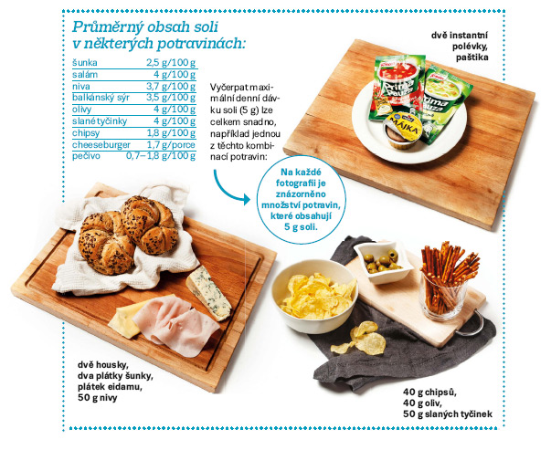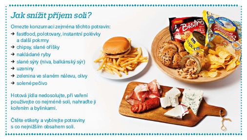 Množství soli v jídelníčcích české populace je průměrně 2–3krát vyšší, než se doporučuje. Pokud se vás vysoký příjem soli také týká, pokuste se o jeho postupné snížení. U soli platí podobné pravidlo jako u cukru, tak jak jsme si na slanou chuť zvykli, tak můžeme tento návyk postupně odbourat.