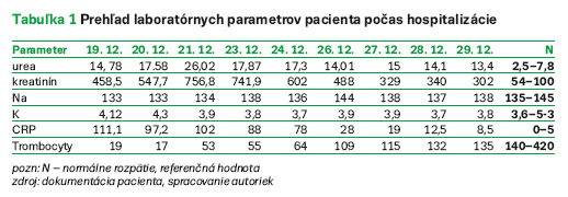 U nášho pacienta dominovala cephalea, dvojité videnie, anúria a celková slabosť. Ako popisuje Bednář (1996), klinický priebeh hantavírusovej infekcie začína nešpecifickými príznakmi – zimnicou, triaškou, horúčkou, bolesťami svalov, brucha, hlavy, časté sú poruchy zraku – dvojité videnie, začervenanie spojiviek. U nášho pacienta dominovala celková slabosť, subfebrílie, bolesti hlavy, brucha a pacient udával rozmazané videnie. Pri fyzikálnom vyšetrení sa preukázala zvýšená citlivosť brucha v oblasti mezogastria a v lumbálnej oblasti. V hypotenzívnej fáze, ktorá vzniká na podklade poškodenia kapilár, sa bolesť hlavy zmenšuje, zvýrazňuje sa však nepokoj, úzkosť až zmätenosť, u niektorých pacientov dochádza až ku delíriu (Novotný et al., 2004). Na štvrtý deň hospitalizácie došlo u nášho pacienta k odozneniu bolesti hlavy, nepokoj, strach a úzkosť sme však pripisovali aj tomu, že pacient bol zdravotník, tak celú situáciu vnímal intenzívnejšie ako laik, keďže išlo o neobvyklú diagnózu. Prechod od anurickej fázy k polyúrii absolvoval aj náš pacient. Začiatok diurézy ,,znamenal, že sme za vodou“. Po realizácii série hemodialýz sa pacientov stav subjektívne i laboratórne výrazne zlepšoval (tabuľka). Bednář (1996) uvádza, že typické laboratórne nálezy sú trombocytopénia (75 %), leukocytóza (50 %), pričom výrazná leukocytóza je prognosticky nepriaznivým faktorom, ďalej sú to zvýšený hematokrit, zvýšený kreatinín, proteinúria (94 %), pyúria (28 %), hematúria (58 %), anémia (50 %). U nášho pacienta boli zaznamenané všetky tieto laboratórne nálezy okrem pyúrie.