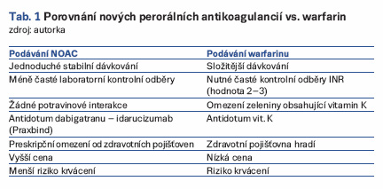 Od roku 2011 nastupuje nová generace antikoagulancií, která nazýváme NOAC (nová perororální antikoagulancia), která jsou stejně účinná v prevenci ischemické cévní mozkové příhody v porovnání s warfarinem. Mezi NOAC řadíme: přímý inhibitor trombinu (dabigatran – preparát Pradaxa) a přímé inhibitory faktoru Xa (apixaban – preparát Eliquis a rivaroxaban – preparát Xarelto) (Matoušková, 2016). Výhodou těchto preparátů je, že nevyžadují časté monitorování antikoagulačního účinku, který je, jak literatura uvádí, dobře předvídatelný, nejsou známy žádné lékové ani potravinové interakce a snižují riziko intrakraniálního krvácení ve srovnání s warfarinem. NOAC jsou nejen účinná, ale také bezpečná. Bohužel, tato terapie mnohonásobně převyšuje náklady na warfarin nebo na protidestičkové přípravky (Táborský, 2013). Porovnání přípravku NOAC a warfarinu je uvedeno v tabulce 1.