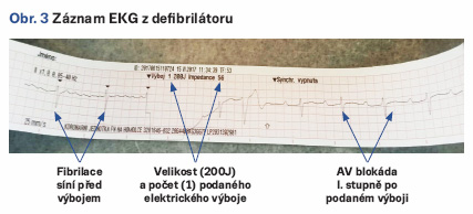V průběhu podání elektrického výboje jsou nemocnému monitorovány fyziologické funkce à 5 minut do stabilizace. Po ukončení elektivní kardioverze probudí anesteziolog nemocného do plného vědomí a provede zápis do anesteziologického záznamu. Sestra po verzi provede opět záznam dvanáctisvodového EKG a sleduje celkový stav nemocného – vědomí, krevní tlak, srdeční puls, EKG křivku a saturaci hemoglobinu pulsním oxymetrem. Záznam z defibrilátoru (obr. 3) vložíme do pacientovy dokumentace. Nemocný je monitorován další dvě hodiny po výkonu. Po uplynutí této doby může nemocný jíst a pít. Pokud během monitorace nenastanou žádné komplikace, opouští nemocný ambulantní lůžko v doprovodu rodiny. Z oddělení nesmí odcházet sám!!! Dále je edukován o tom, že by po propuštění neměl řídit automobil ani řešit důležité a právní záležitosti z důvodu podaných sedativ.