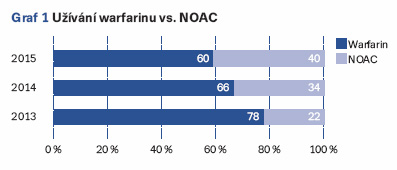 Jak je z grafu 1 patrné, v roce 2014 se počet nemocných užívajících NOAC zvýšil na 34 % a snížil se počet nemocných užívající warfarin na 66 %. Oproti předchozímu roku tak došlo k poklesu užívání warfarinu a vzestupu užívání NOAC o 12 %. V 10/2015 vzrostl počet nemocných užívajících NOAC na 40 %, užívání nových perorálních antikoagulancií tak vzrostlo o 6 %, naopak užívání warfarinu kleslo na 60 %. Jak z grafu vyplývá, vzrostl počet nemocných užívajících nová perorální antikoagulancia (NOAC) v období 2013–10/2015 postupně o celkem 18 %; z 22 % na počátku na 40 % na konci sledování. Naopak dochází ke snižování užívání warfarinu (ze 78 % nemocných na počátku na 60 % na konci). Můžeme konstatovat, že i přes některé nevýhody NOAC, které již byly zmíněny, stoupá počet nemocných, kteří užívají NOAC. Z NOAC pak naši nemocní užívali nejčastěji (19 %) preparát Pradaxa (dabigatran).