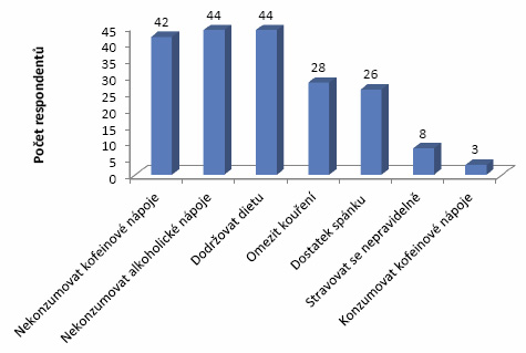 Dále jsme zjišťovali, zda respondenti skutečně dodržují jednotlivá režimová opatření. Z výzkumného šetření vyplynulo, že téměř většina respondentů dbá na správnou přípravu vhodné stravy, ale pouze polovina se stravuje pravidelně, respondenti konzumují alkoholické nápoje a většina také nápoje s obsahem kofeinu. Podle Lukáše a Žáka (2007) se v současné době na dietní opatření neklade takový důraz jako před objevem účinných léků, ale neznamená to, že kvalitní a pravidelná strava není nutná. Kohout a Pavlíčková (2007) také uvádějí, že k tomuto základnímu opatření je důležité brát zřetel na dostatečný spánek, pravidelný denní režim a psychický klid. Z našeho výzkumného vzorku vyplynulo, že polovina respondentů má narušený denní režim, nedostatečný spánek a prožívá stresové situace.