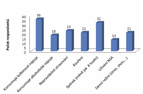 Poslední oblastí, které jsme se v dotazníku věnovali, byla charakteristika denního režimu respondentů. I zde měli respondenti možnost zaškrtnout více odpovědí na jednu otázku. Téměř polovina 21 (40 %) respondentů odpověděla shodně, že prožívají stres, jsou ve shonu a mají sedavé zaměstnání, práci v noci označilo 8 (15 %) respondentů a pouze 5 (10 %) z nich označilo psychický klid.