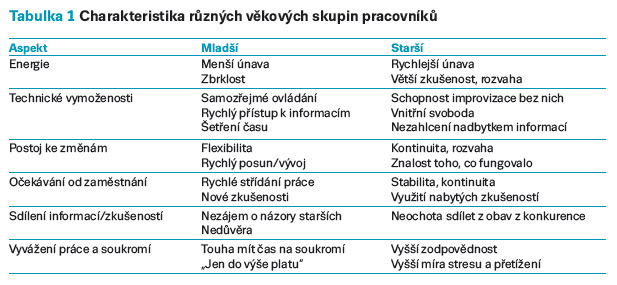 Existuje mnoho mýtů, které se týkají náhledu na různé generace. Starší lidé si často myslí, že mladí jsou nezodpovědní, neloajální, povrchní a drzí. Mladí jim to „oplácejí“ názorem, že starší jsou pomalí, neflexibilní, postaru myslící a často nemocní. To je však nežádoucí paušalizování. Následující tabulka shrnuje charakteristiky různých věkových skupin pracovníků. Ti starší na tom rozhodně nejsou nijak hůře než mladší. To je dobré si uvědomit dříve, než začneme trpět zbytečnými předsudky (tab. 1).