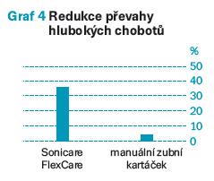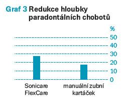 Během fáze indukce zánětu vzrostly hodnoty PI, GI a BOP 1,8krát, 1,2krát a 1,4krát ve všech třech skupinách pacientů s parodontitidou, ačkoli žádné signifikantní změny nebyly pozorovány u PD a CAL. Po čtyřech týdnech vlastní hodnoticí fáze vykazovalo použití zubního kartáčku Sonicare FlexCare ve všech třech skupinách signifikantně větší zlepšení (p < 0,05) mezizubního skóre všech ukazatelů kromě CAL. Zejména použití zubního kartáčku Sonicare FlexCare vedlo k signifikantně většímu zlepšení (p < 0,01) hlubokých parodontálních chobotů (PD ≥ 4 mm), tj. o 35,8 % ve srovnání s použitím manuálního zubního kartáčku, kde bylo dosaženo snížení jen o 2,8 %. Tudíž používání Sonicare FlexCare signifikantně snížilo průměrnou hodnotu zjištěné hloubky parodontálního chobotu o 6,5 % ve srovnání s 1,0 % při používání manuálního zubního kartáčku (p ≤ 0,01).