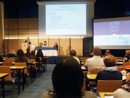 Hojení ran byl věnován třetí blok přednášek. Zazněla v něm sdělení věnovaná například hodnocení mukozitidy v dutině ústní od autorky M. Malé z FN Brno nebo kazuistiky věnované dehiscenci operačních ran na KHO od M. Vzorkové z FN Ostrava. A. Borodzicz z Polska hovořila o podvýživě u onkologicky nemocných a K. Hašová z FN Ostrava seznámila posluchače s dílčími výsledky studie, kterou na základě vnitřního grantu realizují na KHO ve FN Ostrava. Primárním cílem studie je porovnat frekvenci výskytu lokálních infekčních komplikací při použití přípravku hydrofilní metakrylátový gel a při použití přípravku fólie s 2% chlorhexidinem pro krytí místa zavedení centrálního žilního katetru v podmínkách intenzivní péče na souboru pacientů imunokompromitovaných a na souboru pacientů bez významného snížení imunity. Z dílčích výsledků vyplývá, že u pacientů bez neutropenie ošetřovaných fólií s 2% chlorhexidinem je o 30 % menší výskyt známek zánětu v okolí CŽK oproti pacientům s hydrofilním metakrylátovým gelem. Průměrná frekvence výměny krytí na CŽK navíc potvrzuje fakt, že čím je menší frekvence výměny, tím méně dochází ke vzniku známek zánětu v okolí CŽK.