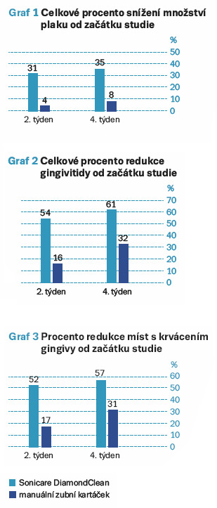 U zubního kartáčku Sonicare DiamondClean byla v porovnání se stavem na začátku studie prokázána signifikantní redukce gingivitidy po dvou a čtyřech týdnech používání produktu (p < 0,0001) (graf 1). U zubního kartáčku Sonicare DiamondClean byla v porovnání se stavem na začátku studie prokázána signifikantní redukce počtu míst s krvácením gingivy po dvou a čtyřech týdnech (p < 0,0001) (graf 2). Zubní kartáček Sonicare DiamondClean byl v porovnání s manuálním zubním kartáčkem signifikantně účinnější, pokud jde o redukci gingivitidy a počtu krvácejících míst, po dvou a čtyřech týdnech (p < 0,0001). U zubního kartáčku Sonicare DiamondClean bylo v porovnání se stavem na začátku studie prokázáno signifikantní snížení množství plaku po dvou a čtyřech týdnech používání produktu (p < 0,0001) (graf 3). Zubní kartáček Sonicare DiamondClean byl v porovnání s manuálním zubním kartáčkem signifikantně účinnější, pokud jde o celkové procentuální snížení množství plaku po dvou a čtyřech týdnech (p < 0,0001). Zubní kartáček SonicareDiamond Clean byl v porovnání s manuálním zubním kartáčkem účinnější, pokud jde o snížení množství plaku ve všech dílčích hodnocených oblastech ústní dutiny, po dvou a čtyřech týdnech (p < 0,0001).