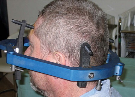 Dříve používaný způsob ozáření v pevném – invazivním stereotaktickém rámu znamenal pro pacienta celodenní nebo několikadenní pobyt na radioterapeutickém oddělení s invazivně připevněným nepohodlným kovovým rámem, navrtaným čtyřmi šrouby do lebky. Složitý a náročný proces přípravy, plánování i nastavení k samotnému ozáření vyžadoval přímou fyzickou účast a spolupráci personálu celé kliniky – lékaře, fyzika, technika, asistentů a současně personál spolupracujících klinik, neurochirurgů, popř. anesteziologa – a trval několik hodin. Tato „rámová“ fixace hraje i nadále nezastupitelnou roli např. na gama noži (obr. 3, 4).
