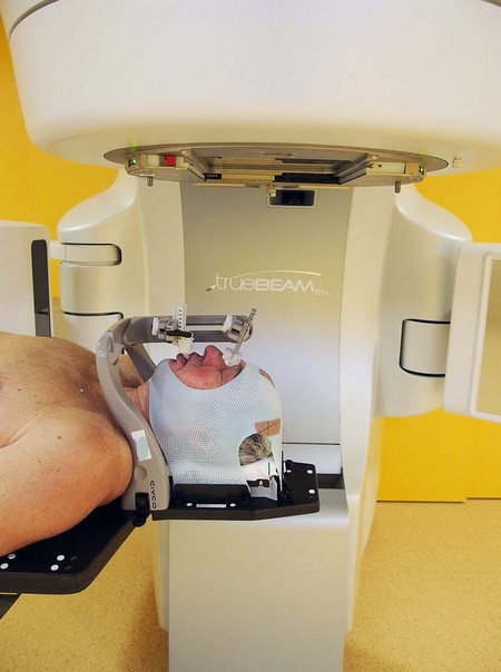 Poloha pacienta musí být striktně stejná jako při snímání plánovacích CT snímků, které slouží jako referenční. Reprodukci polohy provedeme dle údajů z CT simulátoru. Pacient se uloží na ozařovací stůl na záda, hlava mu musí přesně dolehnout do kolíbky, podložíme mu kolena pro větší komfort. Pacient si sám vloží do úst maxilární otisk a pevně jej usadí na čelist a zuby. Upravíme mu rty. Maskou obepneme hlavu pacienta a zacvakneme všechny upínací body. Umístíme stereotaktický rám nad pacientovu hlavu a zamknutím obou zámků zajistíme pevné spojení s ozařovacím stolem. Připneme maxilární fixátor k rámu do dané pozice a nastavíme bloček na kořeni nosu. Dle formuláře ještě jednou zkontrolujeme správnost nastavení všech komponentů. Nastavíme polohu ozařovacího stolu dle značek na masce. Pokud plánující fyzik změnil polohu původního virtuálního izocentra, provedeme odpočet rozdílu a nastavíme stůl dle těchto hodnot. V této pozici provedeme první lokalizační snímky (CBCT – Cone Beam CT), srovnáme s referenčními skeny z CT simulátoru. Případný rozdíl dorovnáme korekcí polohy ozařovacího stolu. Uložíme údaje o pozici do verifikačního systému. Komunikačním zařízením upozorníme pacienta na pohyb stolu a odjedeme do nové ozařovací pozice stolu. Pro kontrolu této polohy můžeme provést druhé lokalizační snímky. Následuje poslední ověření ozařovacích parametrů lékařem a radiologickým asistentem. Samotné ozáření provádíme pod stálou vizuální kontrolou pacienta (obr. 14).
