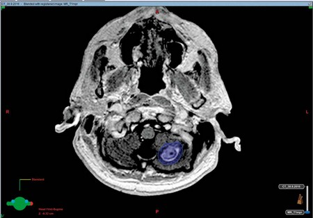 Mezitím ovšem začíná další část procesu pro lékaře radioterapeuta – zakreslení kontur cílových objemů a kritických struktur do plánovacích CT snímků, jejich fúzování s MR pro lepší orientaci a rozlišení v měkkých strukturách (obr. 8, 9).