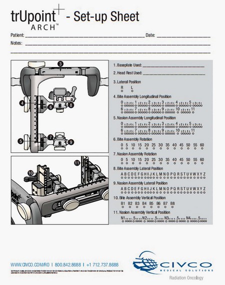 S předstihem připravíme a zkontrolujeme úplnost pacientovy dokumentace, chorobopis, ozařovací protokol, informovaný souhlas s léčbou, stranový protokol a záznamy o obdržené dávce záření, výkaz pojišťovny, přílohu pro záznam nastavení parametrů rámu (trUpoint ARCH Setup Sheet) a do verifikačního systému uložíme data a identifikační foto pacienta. Pacient je důkladně poučen lékařem i asistentem o celém postupu. Odloží veškeré odnímatelné předměty – zubní protézy, brýle, náušnice, vlasové spony, kontaktní čočky a podobně.