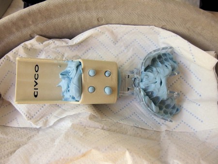- Maxilární fixátor – otisk zubů připravujeme pomocí obloukovitě tvarované plastové vaničky, naplněné zubařskou hmotou, tu pacient vloží do úst a mírně skousne. Rty mu upravíme kolem oblouku. Asistent doladí úhel otisku, aby zapadal do úchytu rámu, a hmota se nechá v ústech ztuhnout.