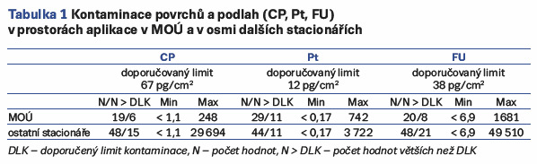 V České republice jsou pravidla pro přípravu CL ukotvena v legislativě (aseptická příprava v lékárně, podtlakový box s vertikálním prouděním, používání sterilních obleků a chemoprotektivních rukavic – obr. 1), pravidla pro aplikaci však nikoliv. Sestra má při podání chemoterapie k dispozici pouze ochranné rukavice a prostory pro aplikaci CL (chemoterapeutické stacionáře) nespadají pod žádné kontrolované či jinak monitorované pásmo. O to důležitější je sledovat tyto prostory a mít povědomí o úrovni kontaminace. V rámci projektu CYTO (cytostatika.cz), zaměřeného primárně na lékárny, byly zahrnuty do pravidelného monitoringu také aplikační prostory. V tabulce 1 jsou uvedeny informace o kontaminaci povrchů a podlah cyklofosfamidem (CP), platinou (Pt) a fluorouracilem (FU) v prostorách Masarykova onkologického ústavu (MOÚ), v nichž dochází k aplikaci, a také v osmi dalších nemocnicích v letech 2015–2016.