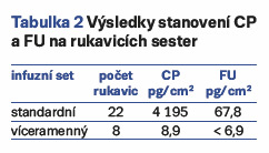 V tabulce 2 jsou znázorněny výsledky. Na rukavicích sester používajících standardní sety byl nalezen CP v hodnotě 4195 pg/cm2 a FU v hodnotě 67,8 pg/cm2. Kontaminace na rukavicích použitých při aplikacích pomocí víceramenných infuzních setů byla nízká. CP zde byl naměřen v hodnotě 8,9 pg/cm2 a nalezené množství FU bylo pod limitem detekce.