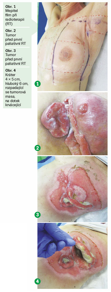 Postup převazu: před každou RT byla pacientka analgetizována, následně bylo odstraněno znečištěné krytí, přiložena obložka s roztokem Prontosanu na 20 minut a na poradiační reakci bylo přiloženo silikonové krytí Mepitel. Po RT bylo krytí vždy upraveno, do tumoru bylo vloženo krytí s aktivním uhlím Actisorb Plus, které bylo následně překryto sekundárním krytím. Na víkend bylo na poradiační reakci přikládáno silikonové krytí se stříbrem.