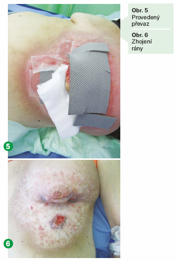 Postup převazu: obložka Prontosanu na 20 minut, do tumoru vkládán Aktisorb Plus, na poradiační reakci přikládán Mepilex Transfer Ag a okolí bylo promazáváno krémem Linola-Radioderm. Na zhojenou lézi po radioterapii bylo přikládáno silikonové krytí Mepitel (obr. 5). Tento postup byl opakován až do úplného zhojení po radioterapii. Pacientka pozorovala menší bolest, sekreci z rány a ustupující zápach. Známky infekce ustoupily, spodina začala granulovat a epitelizovat. Pacientka dobře tolerovala terapeutické krytí a způsob provedení převazu.