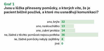 V něm je zaznamenáno, zda byly u lůžka zajištěny pomůcky, které pacient běžně používá a které mu pomáhají při komunikaci. Z celkového počtu 99 odpovědí bylo označeno 32 odpovědí „ano, brýle“ (32,3 %), 13 odpovědí „ano, naslouchadlo“ (13,1 %), 14 odpovědí „ano, zubní protéza“ (14,1 %), 36 odpovědí „ne, žádné z těchto pomůcek nejsou potřeba“ (36,4 %) a 4 odpovědi „ne, žádné pomůcky nejsou zajištěny“ (4,0 %).