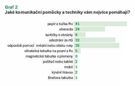 Graf 2 znázorňuje, jaké komunikační pomůcky a techniky nejvíce pomáhají respondentům při jejich komunikaci s pacientem. Z celkových 152 odpovědí označili respondenti jako nejčastější odpovědi „papír a tužka/fix“ (27,0 %) „abeceda“ (15,8 %), „kartičky s obrázky“ (5,8 %), „odezírání ze rtů“ (21,1 %), „odpovědi pomocí mrkání nebo stisku ruky“ (23 %). Dle výsledků zjištění lze tvrdit, že tužka a papír zůstávají i v současnosti nejběžnějším a nejhojněji užívaným prostředkem ke komunikaci.