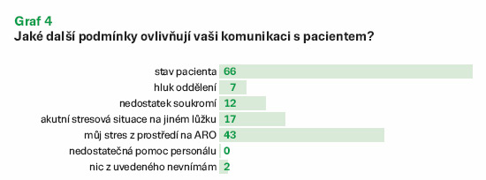 V grafu 4 je znázorněno, jaké další podmínky ovlivňují respondentovu komunikaci s pacientem. Z celkového počtu odpovědí 147 (100 %) uvedli respondenti 66 odpovědí „stav pacienta – únava, slabost, zhoršení stavu“ (44,8 %), 7 odpovědí „hluk na oddělení“ (4,7 %), 12 odpovědí „nedostatek soukromí“ (8,2 %), 17 odpovědí „akutní stresová situace odehrávající se na jiném lůžku“ (11,6 %), 43 odpovědí „můj stres z prostředí na ARO“ (29,3 %). Za pozitivní považujeme zjištění, že žádný respondent neoznačil odpověď „nedostatečná pomoc personálu“.