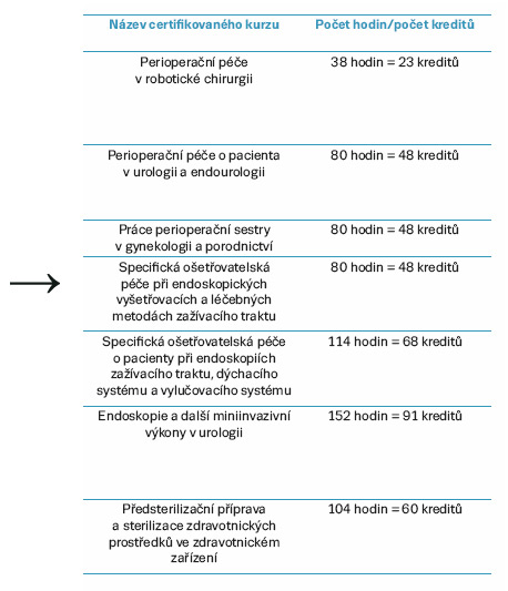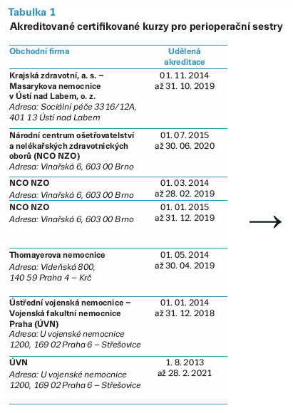 V současné době existuje také několik ministerstvem zdravotnictví akreditovaných certifikovaných kurzů určených perioperačním sestrám (tab. 1).