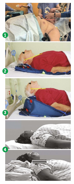 Můžeme se setkat s několika označeními pro tuto polohu, jako např. „HELP position“ (head elevated laryngoskopy position – zvýšená poloha hlavy pro laryngoskopii) (obr. 1–4), „RAMP position“ (Ramp = šikmá plošina) či „Beach chair position“ (pozice plážového lehátka). V podstatě všechny uvedené polohy mají hlavu uloženou výše, než je u čichací polohy neobézních („sniff position“).